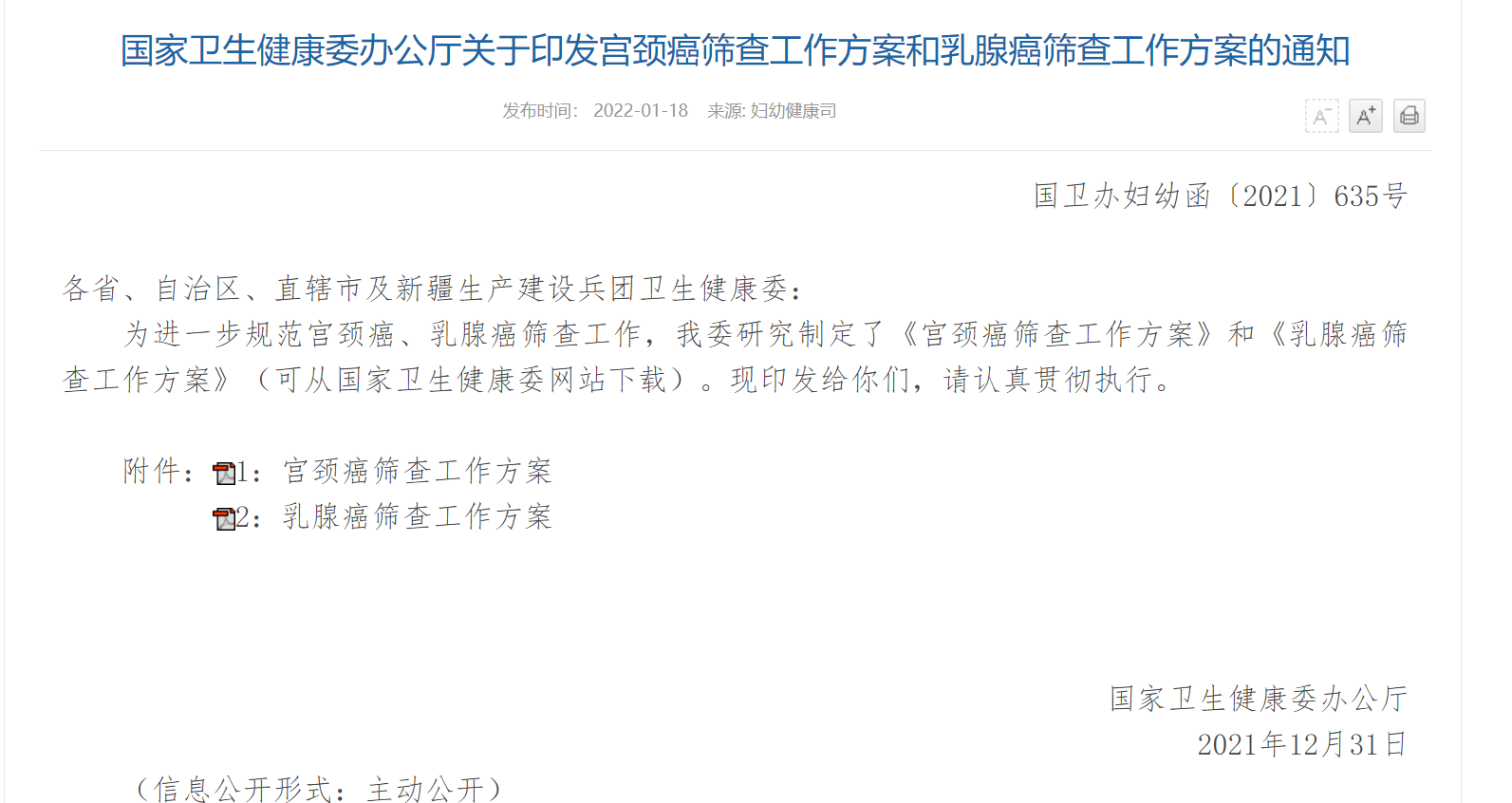 近年来,各地政府不断加大对妇女宫颈癌、乳腺癌筛查工作投入力度,越来越多妇女从中受益。2020年11月,世界卫生组织发布《加速消除宫颈癌全球战略》,提出消除宫颈癌三级预防目标。为突出防治结合、“一病一策”,结合工作新形势,我委对《农村妇女“两癌”检查工作规范》(2019年版)进行了修改完善,组织制定了《宫颈癌筛查工作方案》和《乳腺癌筛查工作方案》,指导地方进一步加强筛查组织管理,完善筛查流程,提高筛查质量和效率,努力提高广大妇女健康水平。